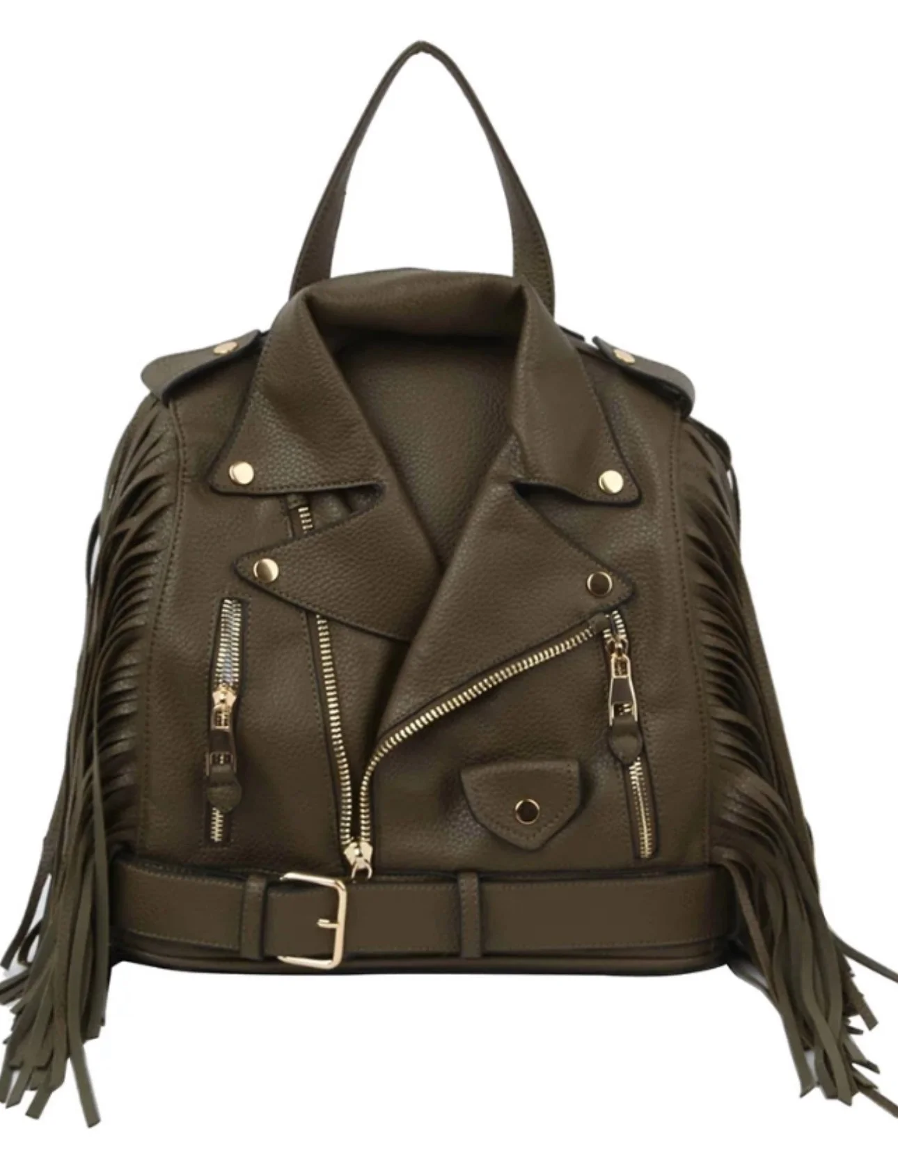 Specialty Bling wear › Fringe Motorcyle Jacket Backpack Image 1 of 2 Image 2 of 2 Fringe Motorcyle Jacket Backpack $85.00 Zip closure. 4L Top handle; adjustable backpack straps Interior zip, 2 slip pockets. Gold hardware Faux leather... Quantity: Add To Cart Added! Zip closure. 4L Top handle; adjustable backpack straps Interior zip, 2 slip pockets. Gold hardware Faux leather...